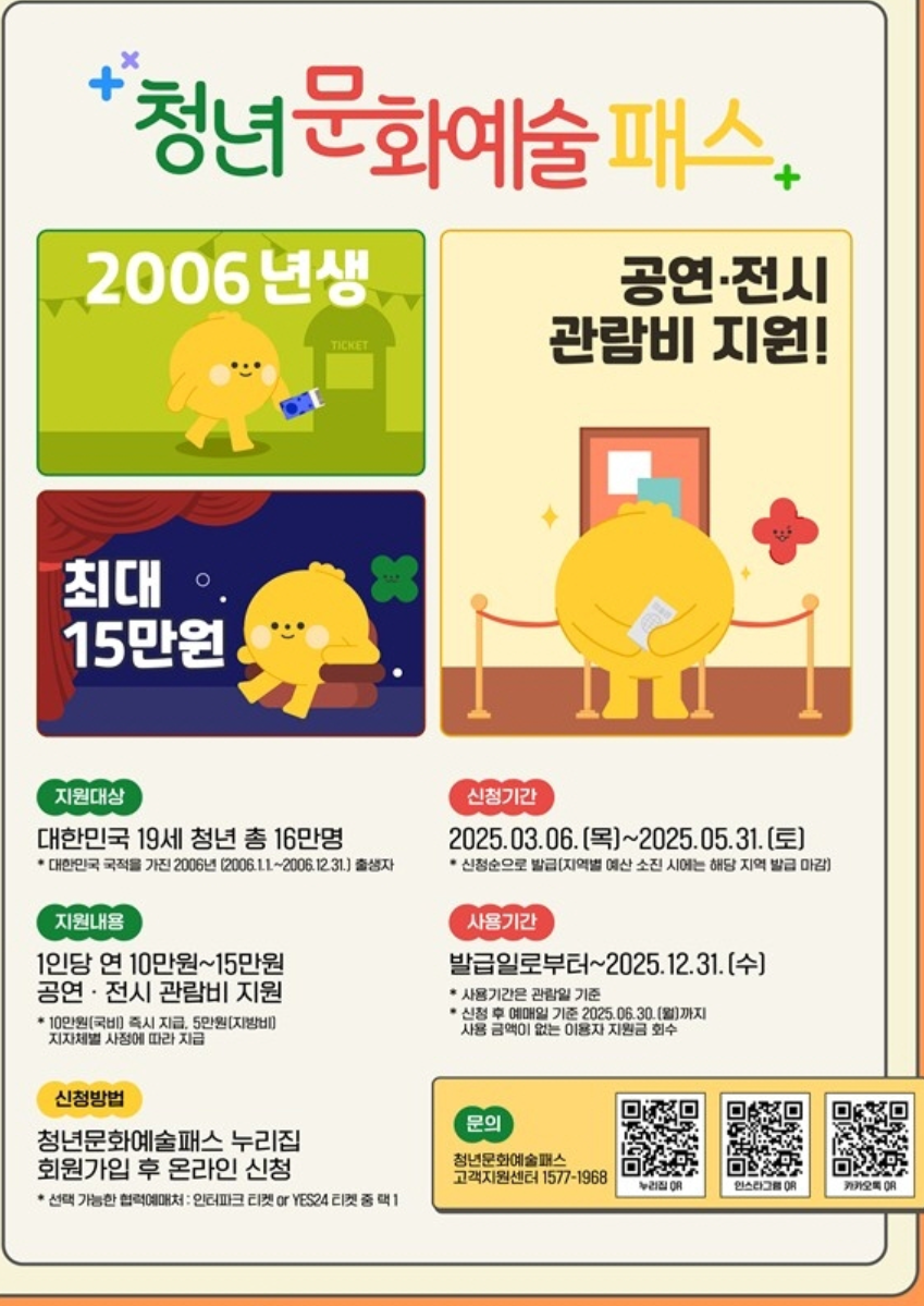 1인당 최대 15만 원의 관람비를 지원해주는 이 제도는 청년들이 문화예술에 관심을 가지고 향후 적극적인 문화소비자로 성장할 수 있도록 돕는 것을 목표로 합니다. 특히 문화생활이 상대적으로 어려웠던 청년층에게는 큰 도움이 될 수 있겠죠.